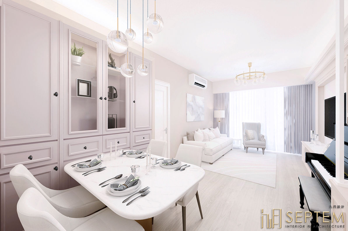 是次項目的主色調較為獨特,以杏、紫色粉系為主,有別於一般接觸甜美系的粉藍、粉紅色。為了烘托出優雅及浪漫的感覺,特意選用粉紫色,因為紫色是一種具有氣質的顏色,加上規劃上使用粉色系色彩能調教輕重感,這種基調的配色,正正能使環境變得更輕巧,令觀賞者入目時感覺放鬆、輕型。